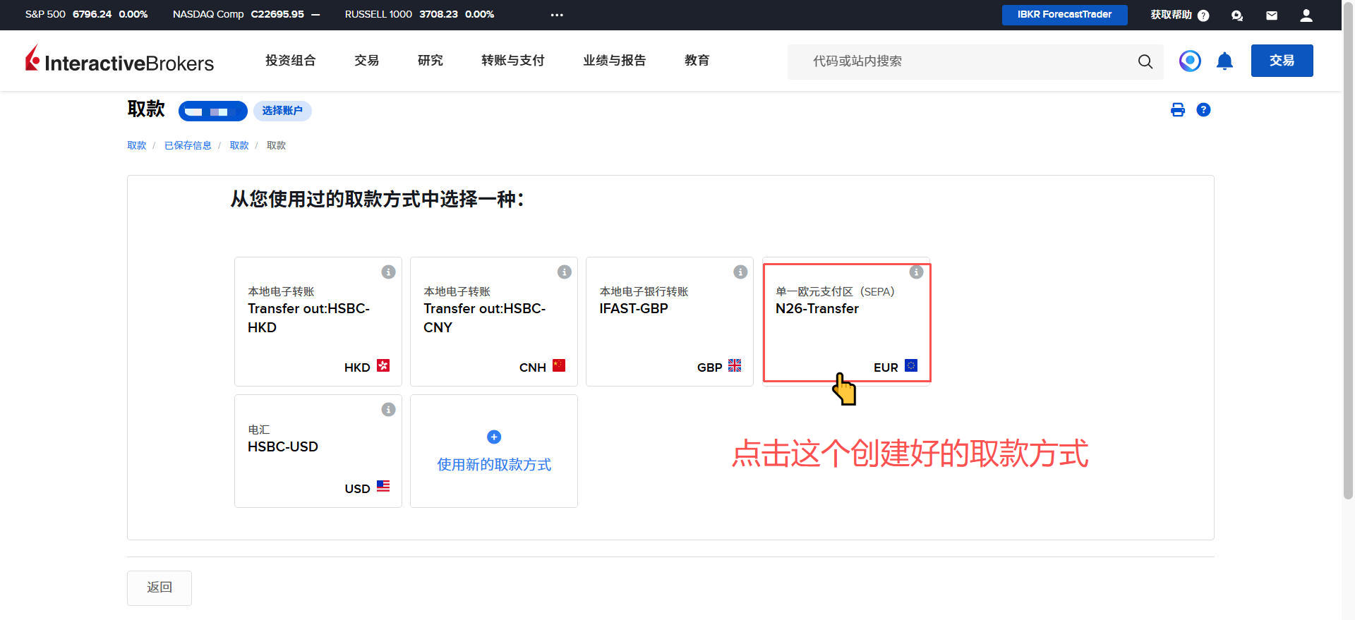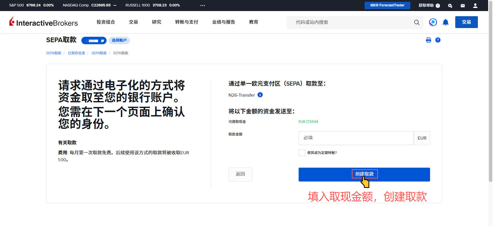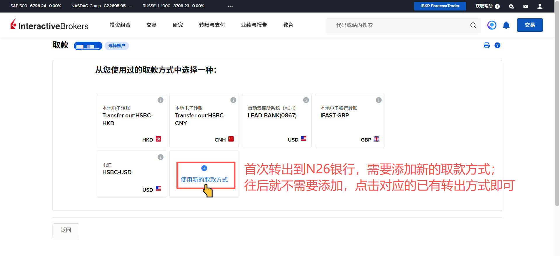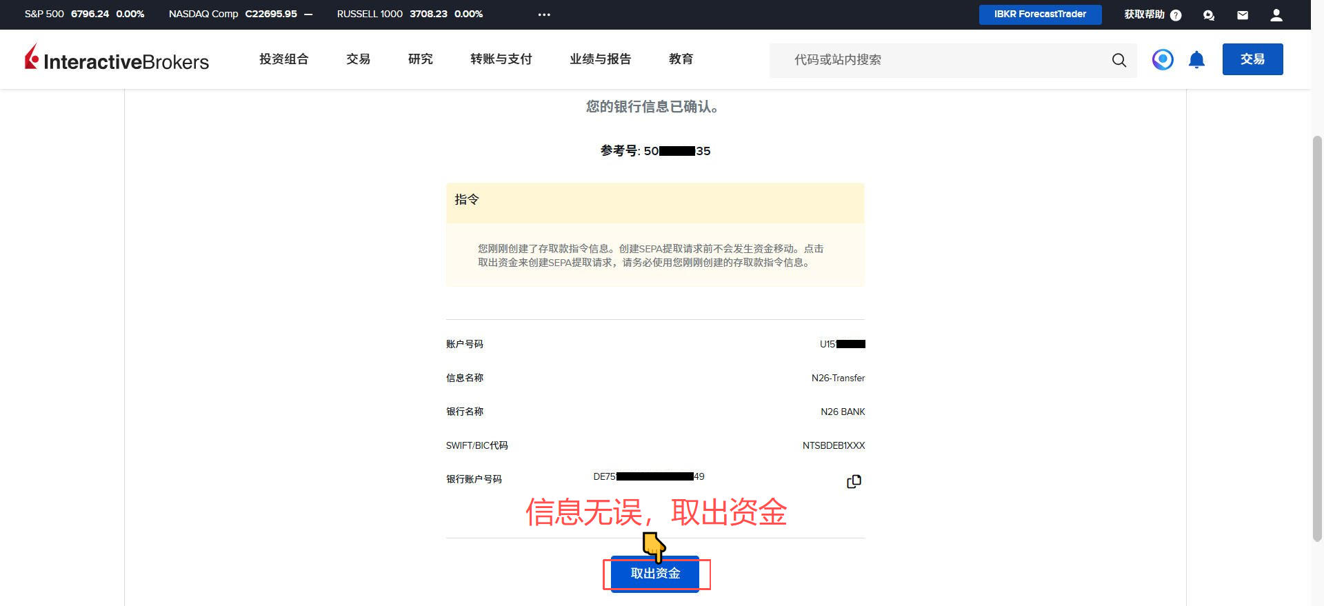 盈透证券-出金欧元到德国N26银行教程 Post author:Henry Li Post published:2026年3月15日 Post category:盈透证券 返回主页 举一反三,取现人民币或港币到香港银行;取现英镑到英国银行等操作都是类似的2️⃣盈透证券每月仅有首次取现是免手续费的;例子:当月第一次取现欧元,第二次取现港币,就是取现欧元免费,取现港币收费。更多平台、账户需要协助注册点击 你可能也喜欢 盈透证券-更换账户类型 2025年12月23日 盈透证券-创建多个子账户 2025年12月24日 盈透证券-创建模拟交易账户 2025年12月24日