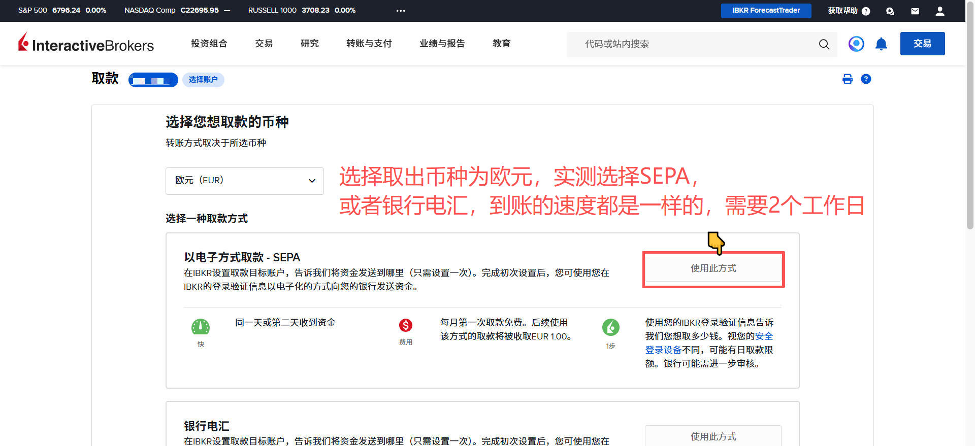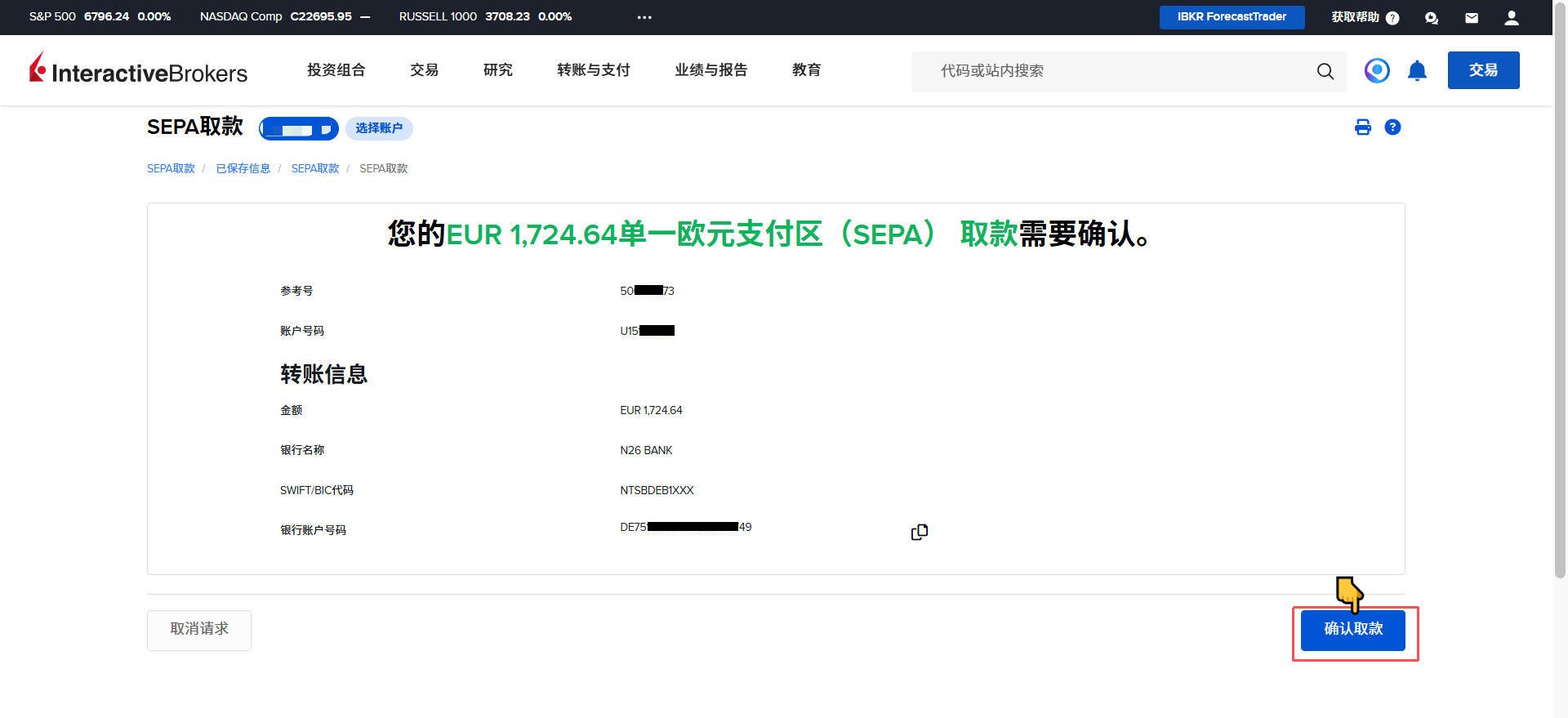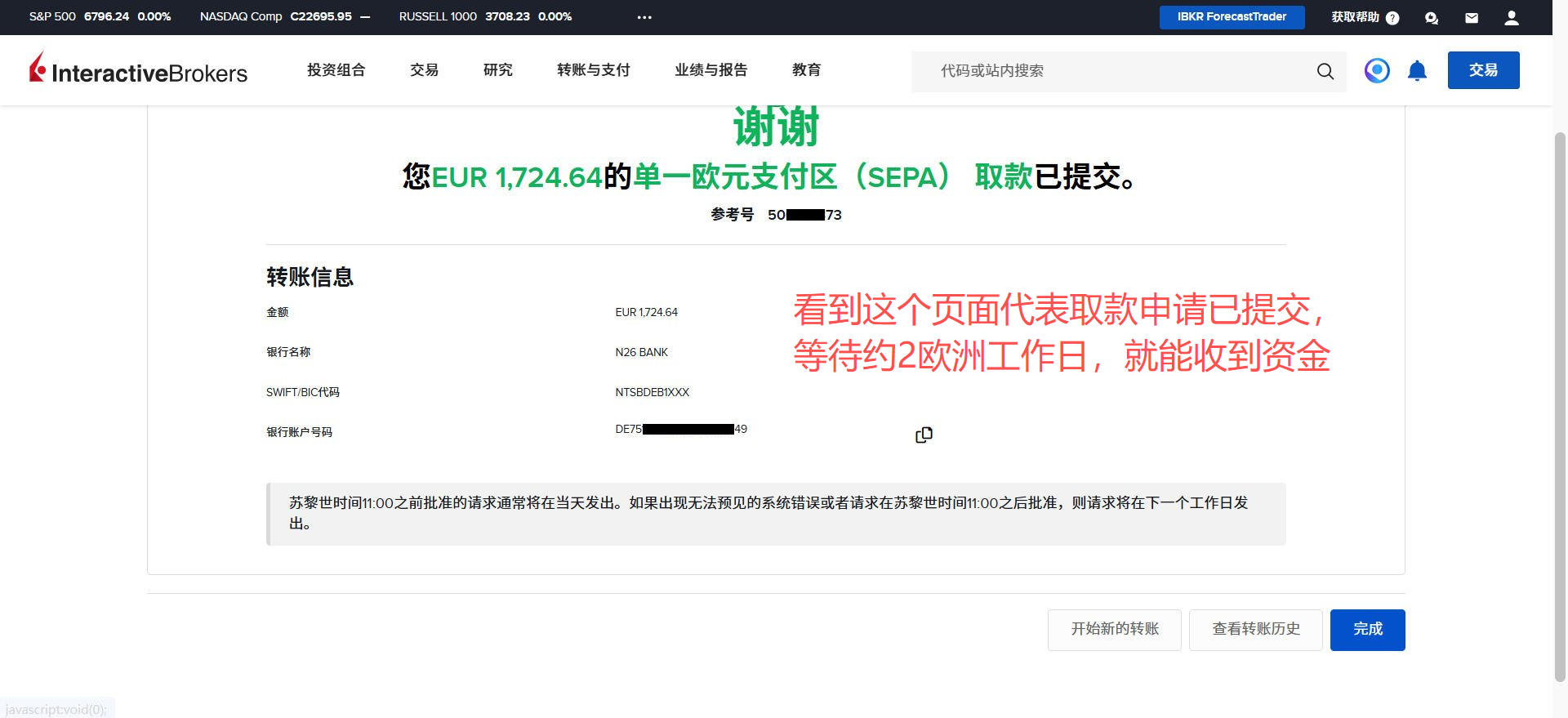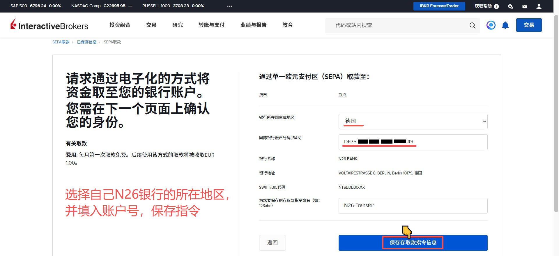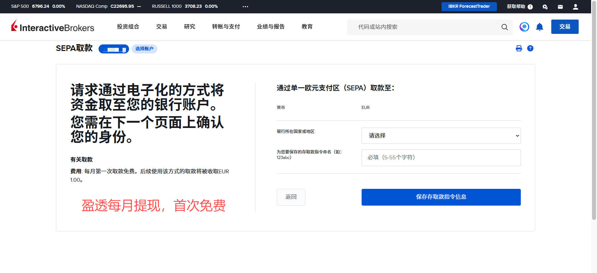 盈透证券-出金欧元到德国N26银行教程 Post author:Henry Li Post published:2026年3月15日 Post category:盈透证券 返回主页 举一反三,取现人民币或港币到香港银行;取现英镑到英国银行等操作都是类似的2️⃣盈透证券每月仅有首次取现是免手续费的;例子:当月第一次取现欧元,第二次取现港币,就是取现欧元免费,取现港币收费。更多平台、账户需要协助注册点击 你可能也喜欢 盈透证券-更换账户类型 2025年12月23日 盈透证券-创建多个子账户 2025年12月24日 盈透证券-创建模拟交易账户 2025年12月24日
