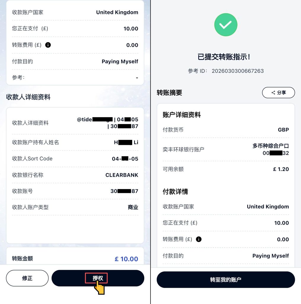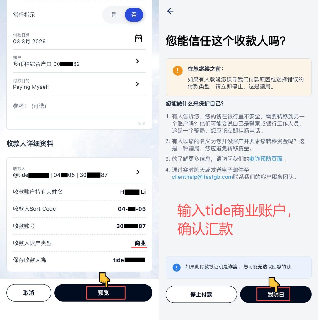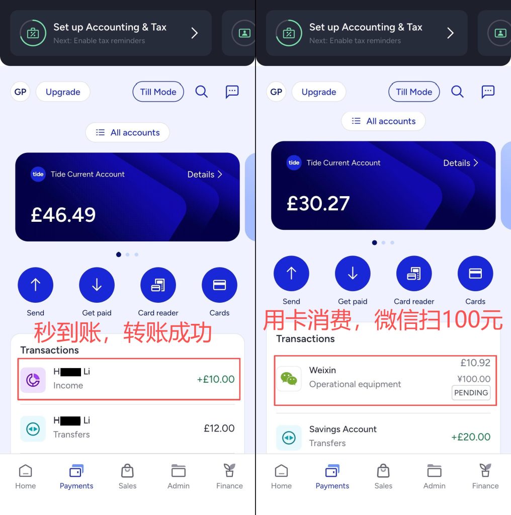 如何用英国本地账户给tide商业账户转账,及tide消费卡损耗 Post author:Henry Li Post published:2026年3月5日 Post category:tide 返回主页 tide的账户是商业账户,卡消费英镑是无任何费用,消费外币会有2.5%左右的损耗注册时填写邀请码:GEPRY8,并在90天内卡消费满500英镑,可以获得tide100英镑的返赠更多平台、账户需要协助注册点击 你可能也喜欢 如何开立tide英国个人商业账户,申请消费卡 2026年2月24日