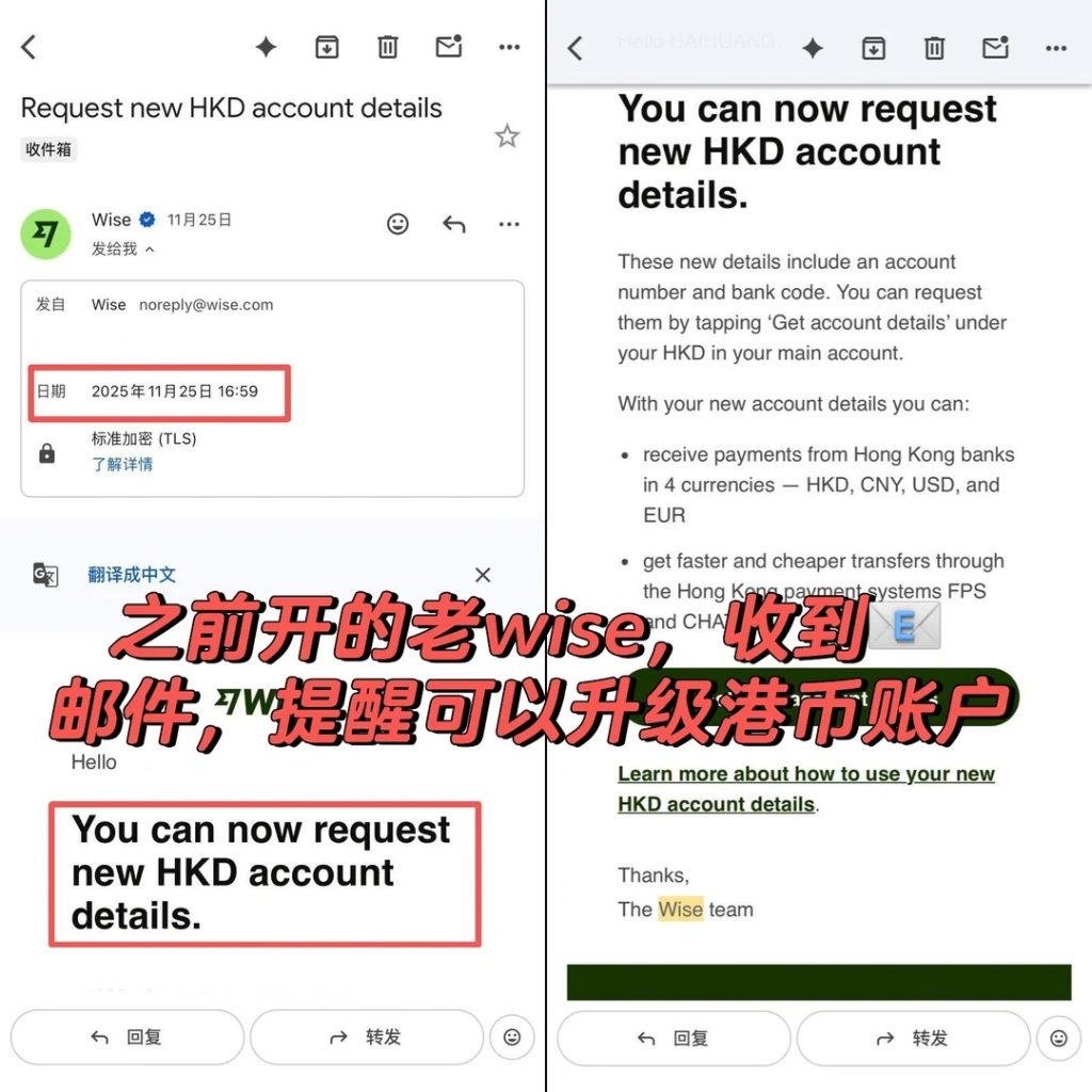 WISE-GB开头的HKD旧账户可升级为香港新展银行账户 Post author:Henry Li Post published:2025年12月2日 Post category:wise Post comments:0评论 返回主页 2025年11月之前申请的老wise才需要升级HKD账户,新申请的wise,港元币种就自带星展银行相当于,不用去香港办卡,在大陆就可以拥有一个香港星展银行(DBS)帐户不要为了wise卡,随便填海外地址,一人只能有一个号,废了号就得等下辈子了注册教程点这里 你可能也喜欢 wise-补填邀请链接 2025年12月27日 wise注册激活 2025年11月27日 wise-如何给wise的香港星展银行账户转账 2025年12月8日 发表回复 取消回复CommentEnter your name or username to comment Enter your email address to comment Enter your website URL (optional) 在此浏览器中保存我的显示名称、邮箱地址和网站地址,以便下次评论时使用。